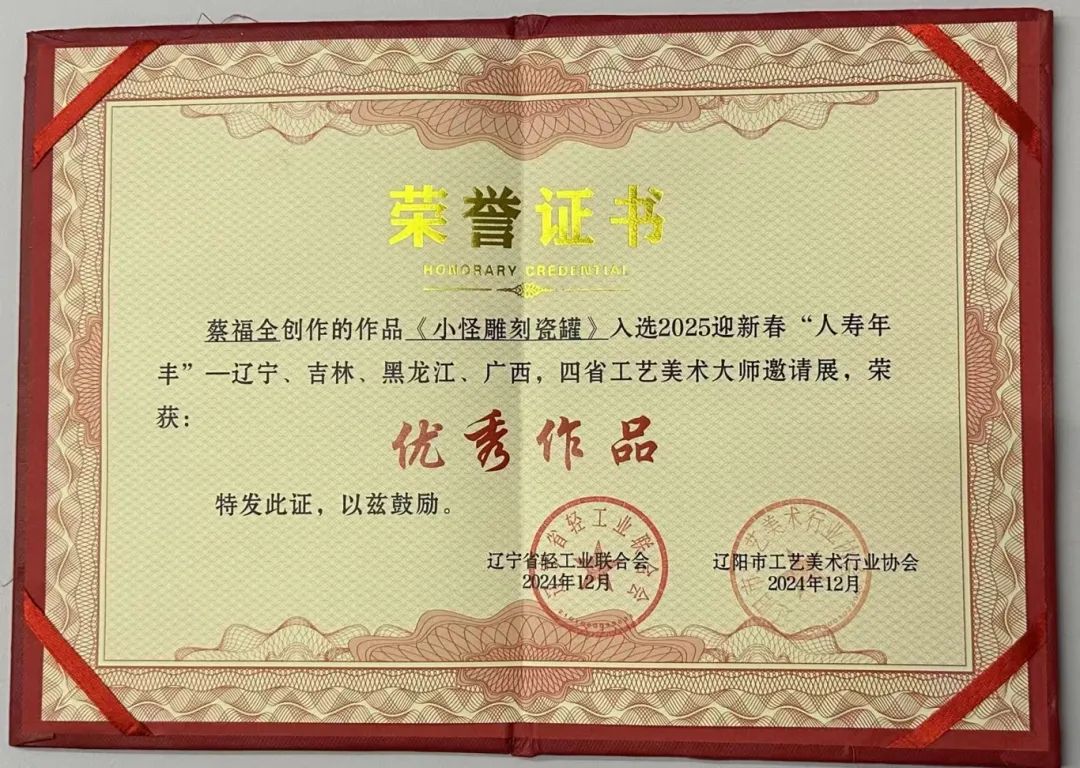 近日,我校大官窑陶艺教师蔡福全创作的《小怪雕刻瓷罐》,入选2025年迎新春“人寿年丰”——辽宁、吉林、黑龙江、广西四省工艺美术大师邀请展,并荣获优秀作品奖。该作品还被辽阳博物馆永久收藏。